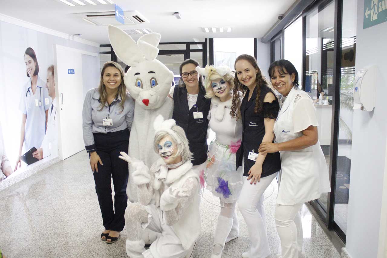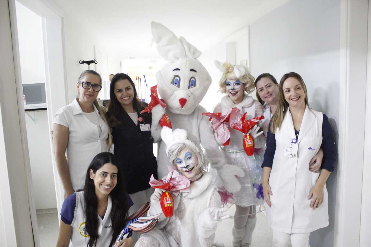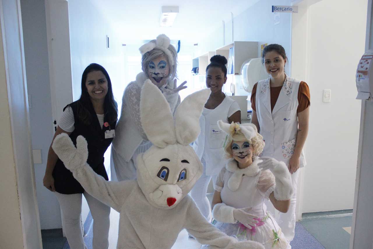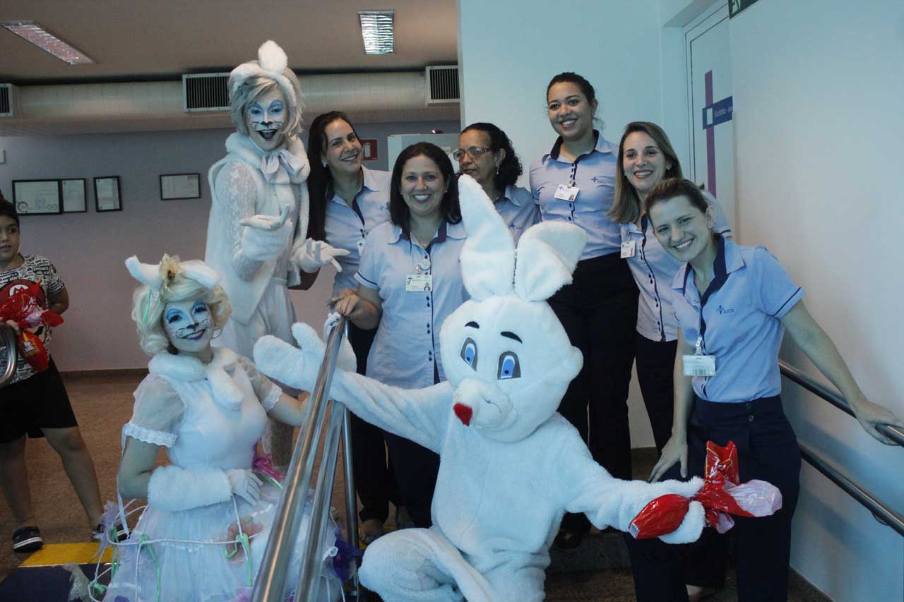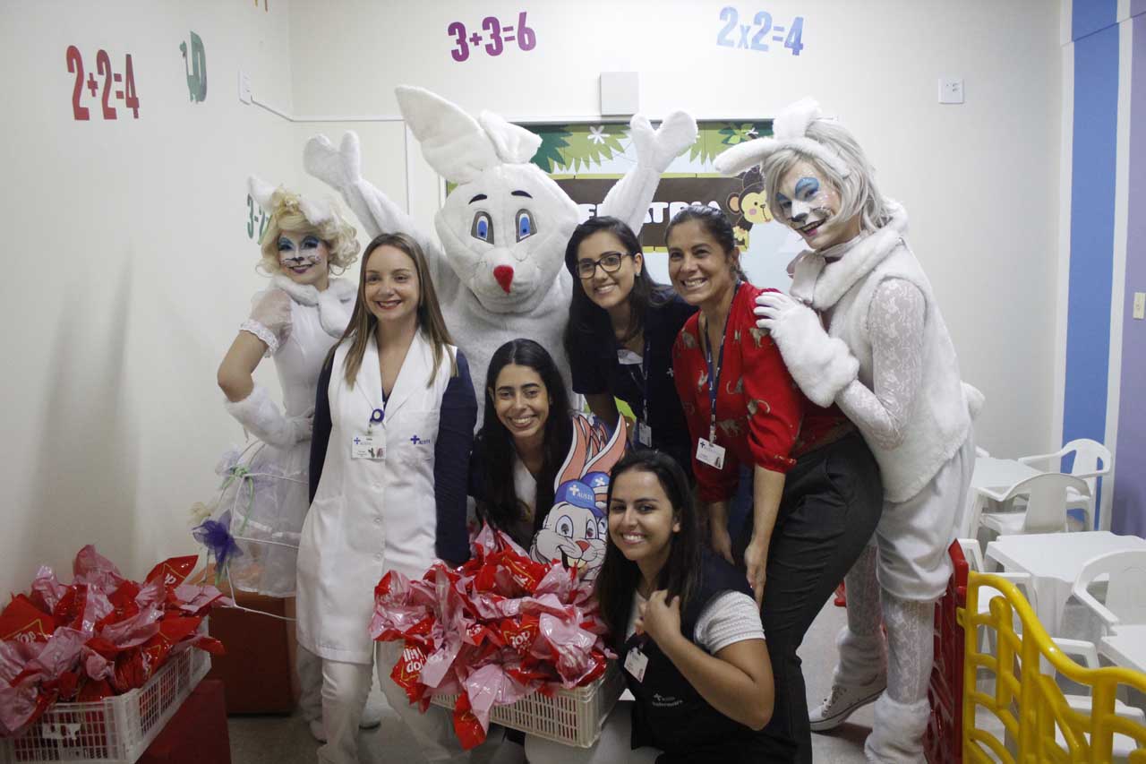 Em mais uma iniciativa que demonstra a humanização do AUSTA hospital, na manhã desta quarta-feira (17 de abril), a instituição surpreendeu as crianças com a visita do coelho da Pascoa, que as presenteou com ovos de chocolate e máscaras do “felpudo” personagem, para entrar no clima festivo. A alegria se espalhou pela pediatria, recepção, emergência, por quartos de internação, pela UTI Neonatal e USI AUSTA.
